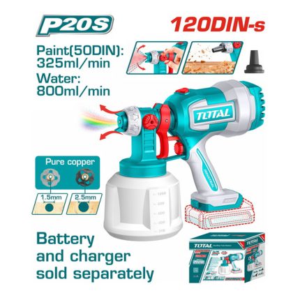 Το TOTAL TSGLI2004 είναι ένα ασύρματο πιστόλι βαφής 20 V Li-Ion, σχεδιασμένο για εύκολη και αποδοτική βαφή σε ξύλο, μέταλλο, τοίχους και άλλες επιφάνειες. Το εργαλείο έρχεται χωρίς μπαταρία και φορτιστή, κάτι που το καθιστά ιδανικό για όσους ήδη έχουν την μπαταριακή σειρά P20s / Share 580+ της Total, ή για όσους θέλουν να επεκταθούν στο σύστημα εργαλείων μπαταρίας της Total.