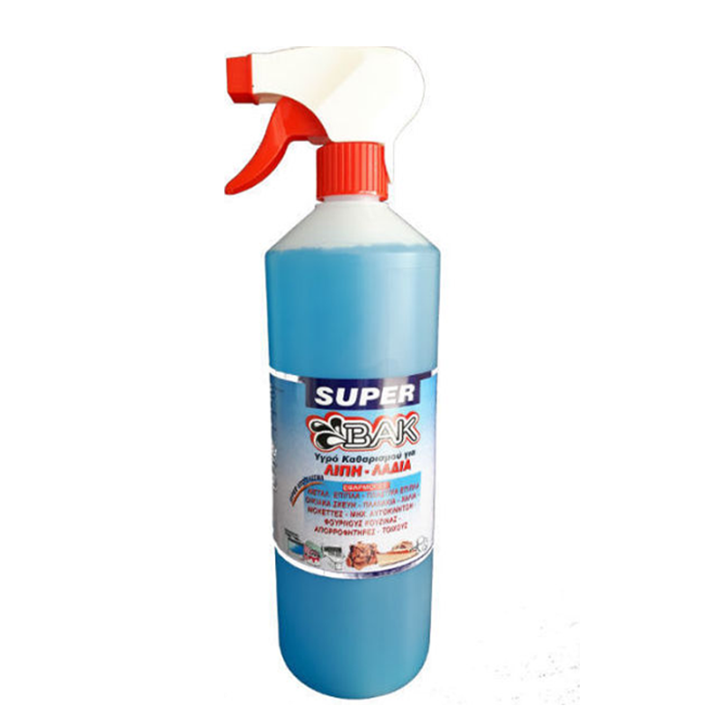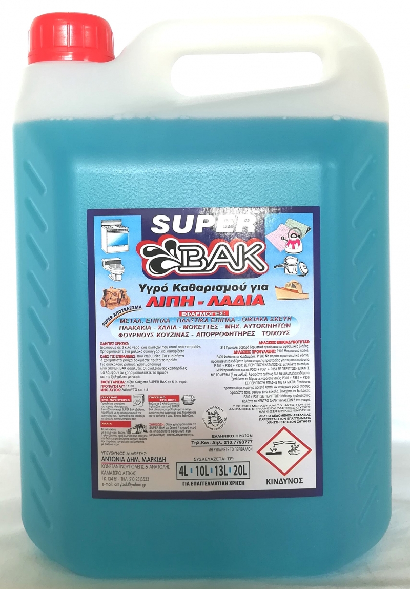 Ειδικότερα το ισχυρό πολυκαθαριστικό SUPER BAK είναι ένα προ’ι’όν για πολλές και διαφορετικές χρήσεις και ανάγκες.Αφαιρεί αποτελεσματικά τόσο λίπη, λάδια, γράσσα όσο και άλλους δύσκολους και επίμονους λεκέδες από επιφάνειες όσο και από ρούχα και μοκέτες ή χαλιά.