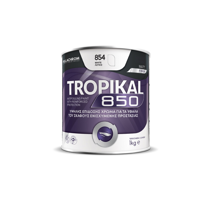 Το TROPIKAL 850 είναι υφαλόχρωμα για την προστασία των σκαφών από την προσκόλληση οστρακοειδών και χόρτου. Είναι κατάλληλο για πλαστικά, ξύλινα και σιδερένια σκάφη και για ταχύτητες μέχρι 35-50 μίλια/ ώρα. Δεν παρουσιάζει αλλαγή στην απόχρωση του όταν βρίσκεται εντός νερού. Περιέχει νέο μικροβιοκτόνο παρατείνοντας τη προστασία του σκάφους στο νερό.