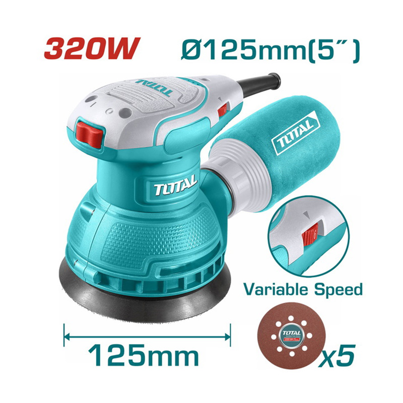 Ηλεκτρικό Τριβείο Χούφτας Total, ένα επαγγελματικό εργαλείο με ισχύ 320W και διάμετρο δίσκου 125mm, ιδανικό για λεπτομερείς εργασίες λείανσης. Διαθέτει εργονομικό σχεδιασμό για άνετο κράτημα και ακρίβεια, ενώ η ισχυρή του απόδοση εξασφαλίζει γρήγορα και ομοιόμορφα αποτελέσματα. Είναι κατάλληλο για επαγγελματίες και ερασιτέχνες που απαιτούν αξιοπιστία και αποτελεσματικότητα σε ξύλο, μέταλλο ή άλλες επιφάνειες.