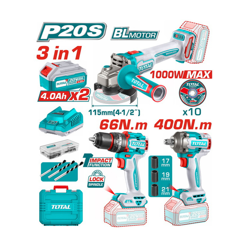 TOTAL TOSLI241291E – Σετ Brushless 20V 3 εργαλείων με 2 μπαταρίες 4Ah & αξεσουάρ